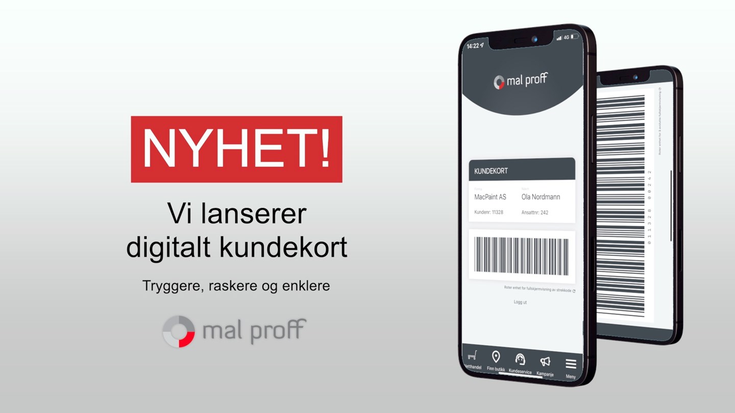 Vi ønsker å gjøre registrering av varer i kassen tryggere, og turen innom en av vår mange Mal Proff-butikker til en enda bedre opplevelse. Derfor lanserer Mal Proff digitalt kundekort som alle våre kunder kan ha lett tilgjengelig på mobilen.