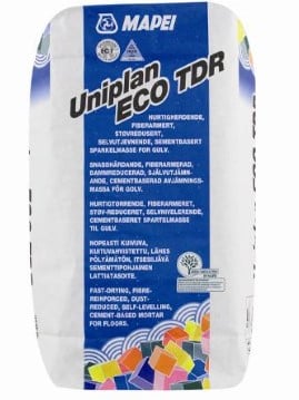 er en støvredusert, selvutjevnende, miljøvennlig, fiberarmert og sementbasert sparkelmasse til avretting av betonggulv og tregulv, der det er behov for svært tidlig belegning. Produktet er støvredusert, og egner seg derfor veldig godt der det er krav om lav eksponering av støv under blanding. Sparkelmassen egner seg i miljøsertifiserte bygg, og gir mulighet for meget tidlig belegning med tett belegg. TDR er beregnet til avretting av betongunderlag og tregulv med tilstrekkelig stivhet. Bruksområdet er gulv i bolig, kontor, institusjon og lett industri der det er behov for tidlig belegning.Uniplan ECO TDR kan benyttes til innstøping av elektrisk gulvvarme eller vannbåren varme i tørre rom og våte rom. I våtrom skal det alltid påføres membran oppå sparkelmassen. Sparkelmassen er KUN beregnet for innvendig bruk. Uniplan ECO TDR tilfredsstiller kravene til EMICODE EC1R Plus - meget lave emisjoner av flyktige organiske forbindelser.
