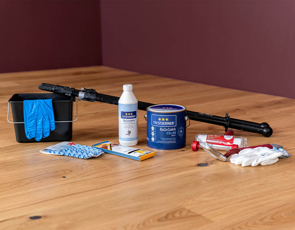 For optimalt resultat, anbefales det å påføre to tynne strøk i ønsket farge med TreStjerner Gulvlakk Color. Avslutt med 1-2 fyldige strøk klar lakk med ønsket glansgrad fra TreStjerner gulvlakk-serien.
